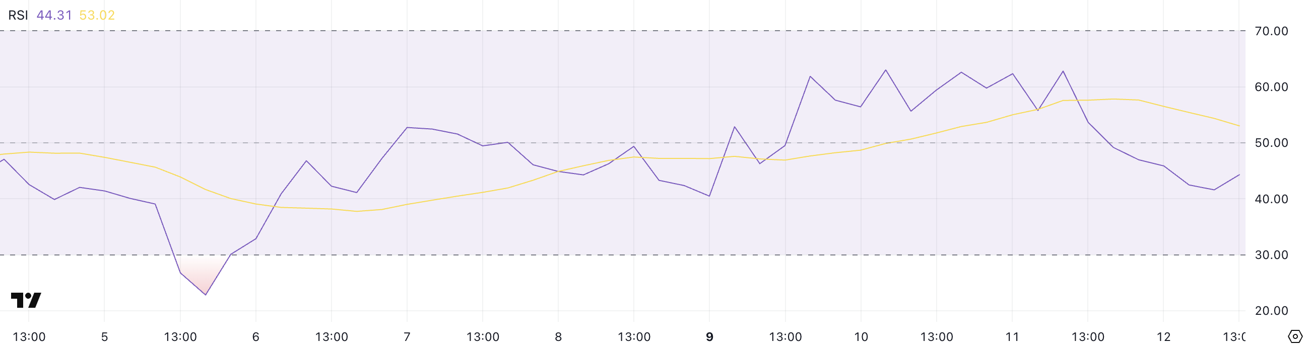 Shiba Inu Göreceli Güç Endeksi (RSI) önemli ölçüde düştü ve şu anda 44,31 seviyesinde—dün sadece 62,8 idi.