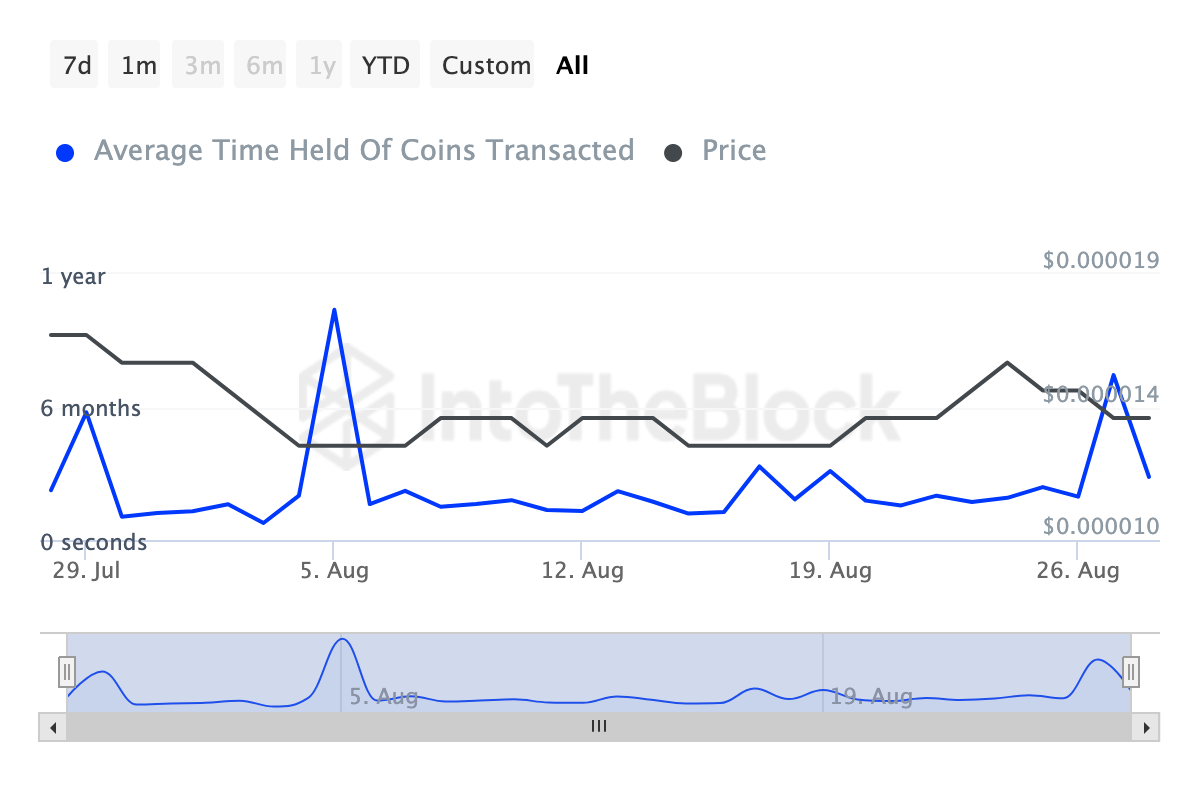 IntoTheBlock’a göre, Shiba Inu’nun Coin Tutma Süresi son yedi günde %42 yükseliş gösterdi. Ayrıca son 30 günde ise %107 arttı. Coin Tutma Süresi (holding), sahiplerin bir varlığı işlem yapmadan veya satmadan ne kadar süre tuttuklarını ölçer.