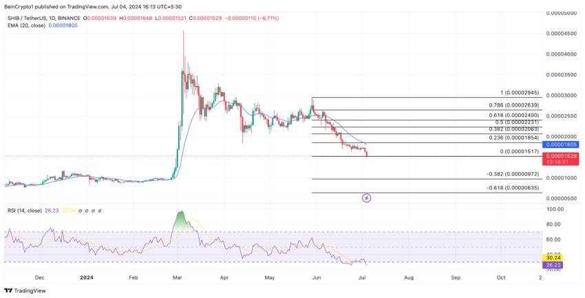 SHIB’nin istikrarlı fiyat düşüşü, fiyatının son 20 işlem gününün ortalama fiyatını ölçen 20 günlük üstel hareketli ortalamasının (EMA) altına inmesine neden oldu.