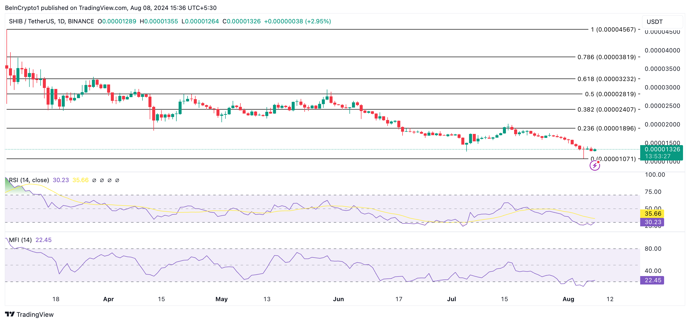 SHIB’in günlük grafiğinden elde edilen okumalar, meme coin’in bir toparlanmaya hazır olabileceğini gösteriyor. Bu yazı itibariyle, Göreceli Güç Endeksi (RSI) ve Para Akışı Endeksi (MFI) değerleri sırasıyla 30.23 ve 22.45’tir.