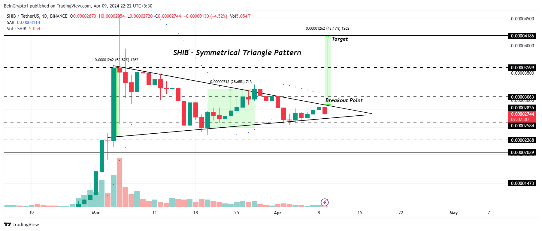 Shiba Inu’nun fiyatı bu yazının yazıldığı sırada simetrik üçgen formasyonunda ve 0,00002744 $’dan el değiştiriyor. Simetrik üçgen formasyonu, trend çizgilerinin birbirine yaklaşmasıyla oluşur ve bir konsolidasyon dönemine işaret eder. Genellikle yukarı ya da aşağı yönlü bir kırılmaya işaret ederek bir önceki trendin potansiyel devamına işaret eder.