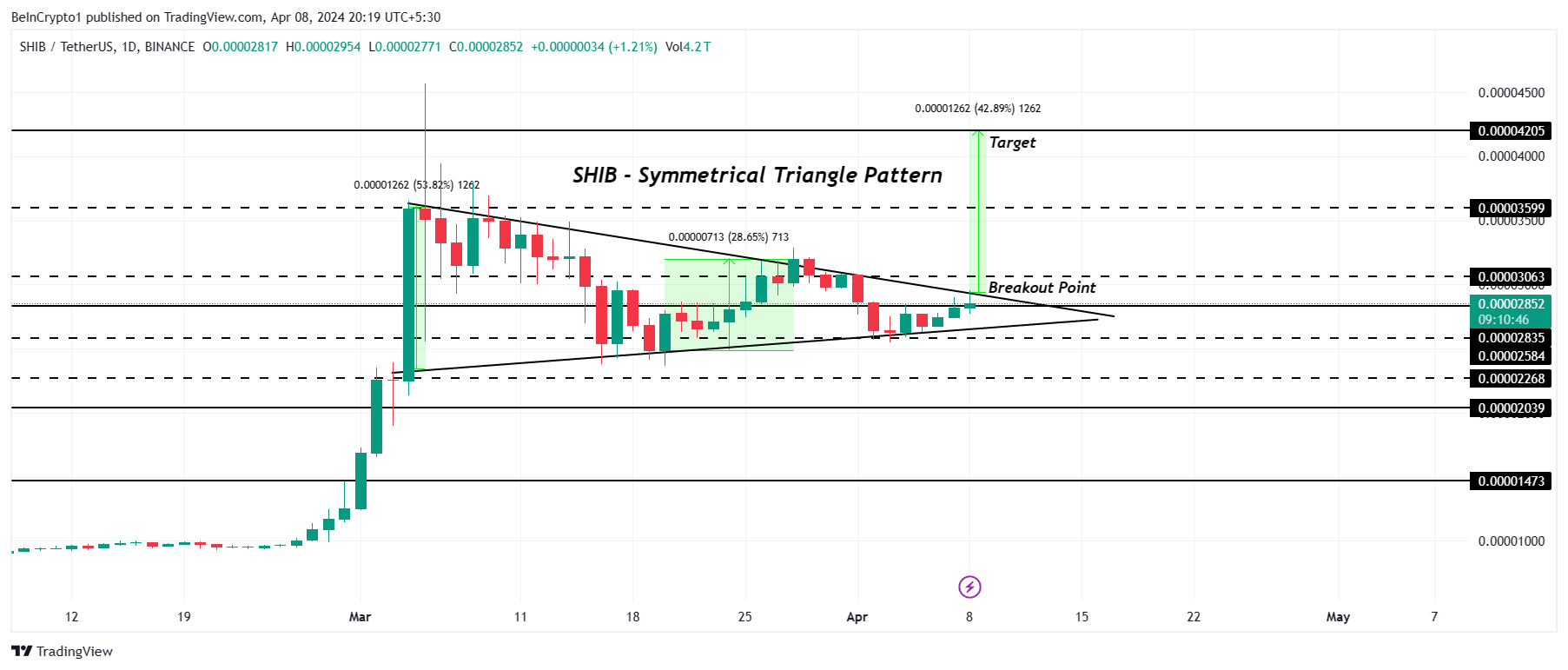 Shiba Inu’nun 0,00002852 $’dan işlem gören fiyatı simetrik üçgen formasyonundan çıkmaya yakın. Böyle bir formasyon, birbirine yaklaşan iki trend çizgisi bir araya geldiğinde oluşur ve piyasada bir kararsızlık dönemine işaret eder.
