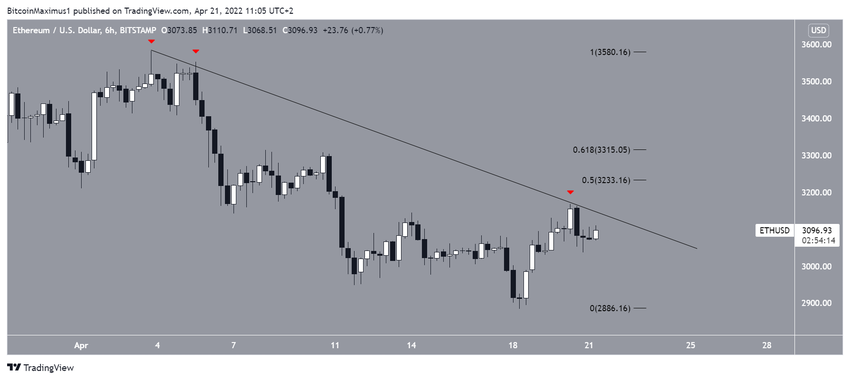 Ethereum (ETH) 3 Nisan’da alçalan bir direnç çizgisini takip etmeye ve değer kaybetmeye başladı. Böylece 20 Nisan’da 2.883 dolar seviyesinde bir dip meydana geldi. Buna ek olarak altcoin, direnç çizgisinden üç kez reddedildi (kırmızı oklar). Son reddedilme ise 20 Nisan’da gerçekleşti.