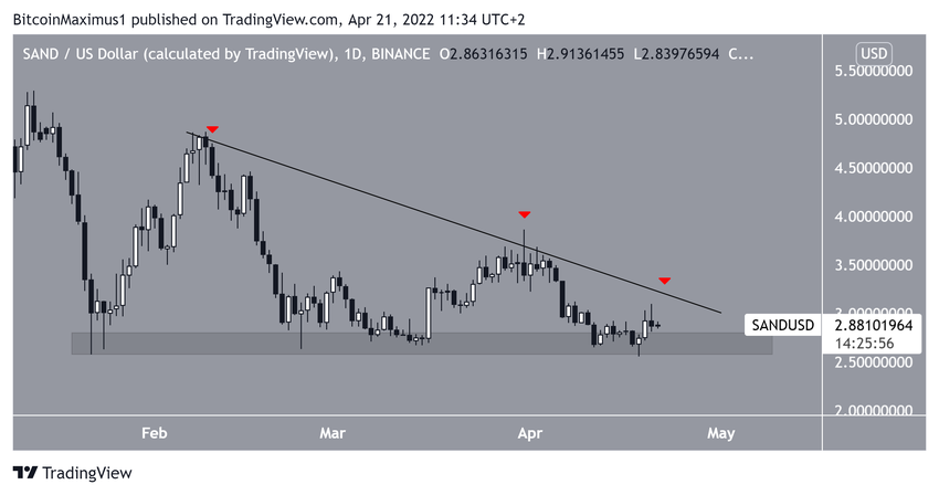 The Sandbox (SAND) 22 Ocak’ta 2,70 dolardaki yatay destek bölgesinden sıçradı. Dahası, 14 Mart ve 22 Nisan tarihlerinde de aynı bölgeden sıçrama gerçekleşti. Ancak her sıçrama, bir öncekinden daha güçsüzdü. Dolayısıyla bu durum, SAND’in alçalan bir direnç çizgisini takip etmesine yol açtı.