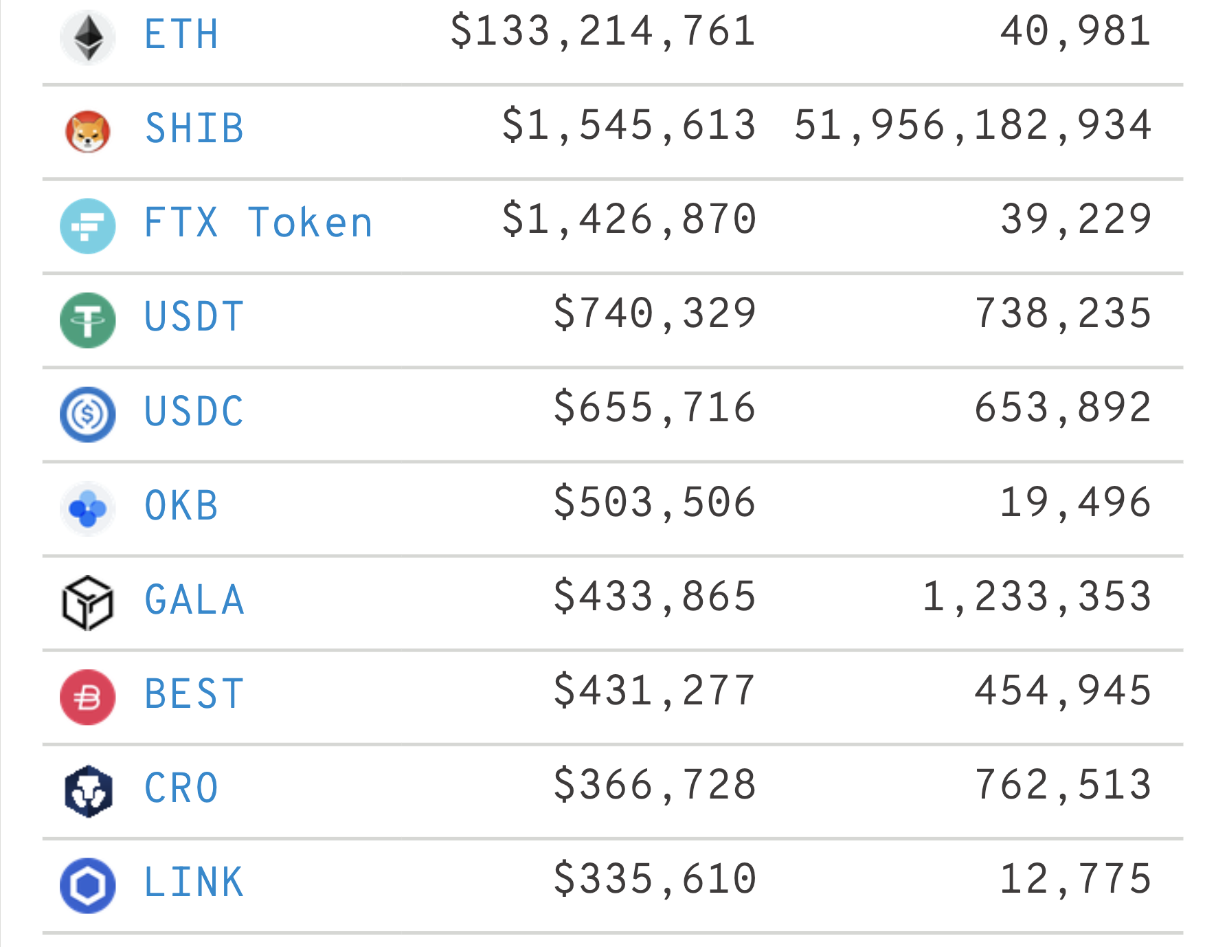 Hesaplarında yüklü Ethereum bulunan hesapların tutmaya devam ettiği altcoin arasında Shiba Inu ilk sırada yer alıyor. Ethereum zincir içi bilgilerine göre oluşan listede sadece Ethereum tokenları yer alıyor. Ethereum tokenları üreten kripto para borsaları da balinaların radarından çıkmıyor. Balinalar Shiba Inu’nun ardından en çok FTX Token (FTT) ve OKB tutuyor.