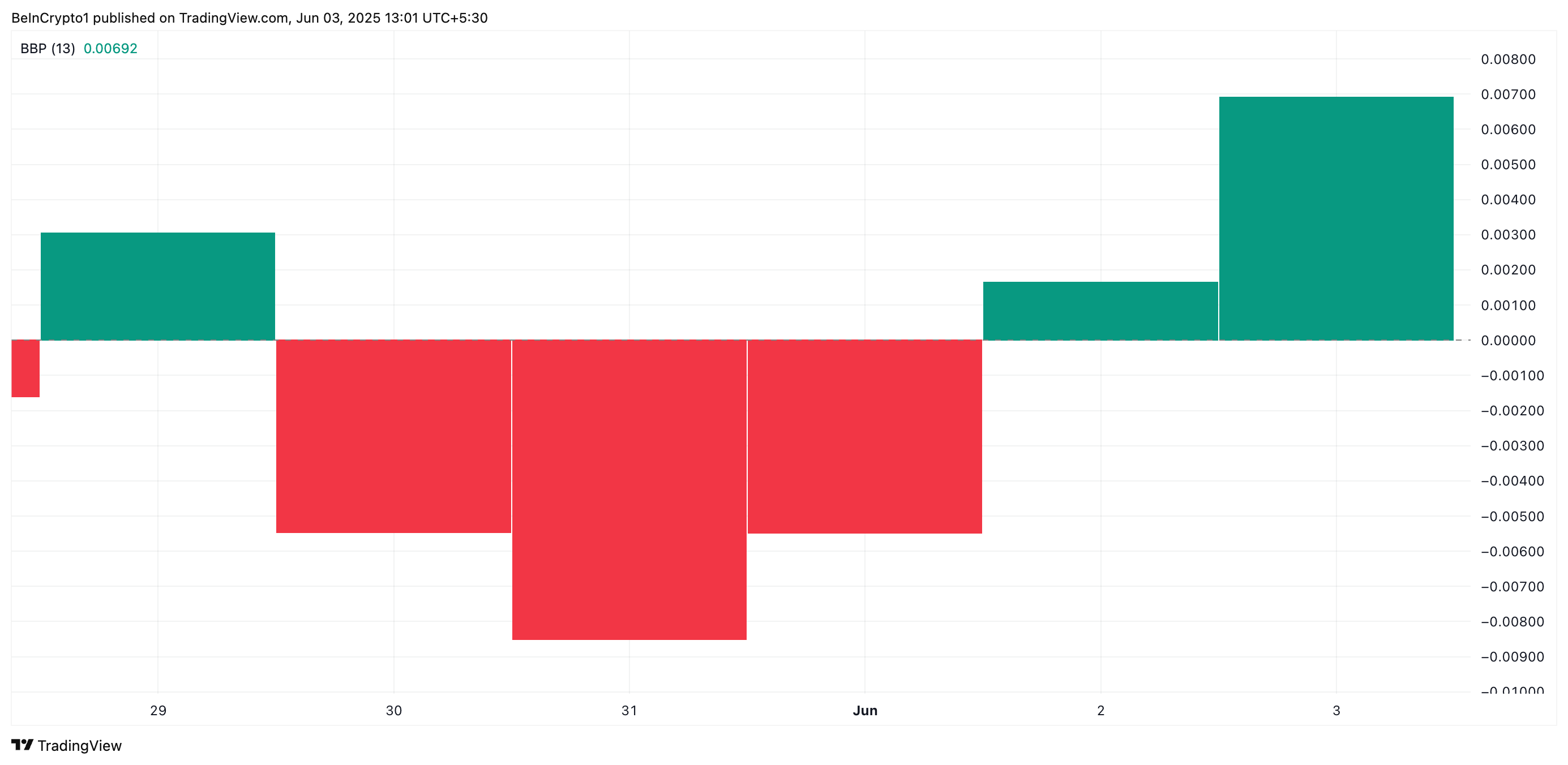 Gösterge, piyasadaki boğaların ve ayıların gücünü ölçer. Yeşil histogram çubukları bastığında, güçlü alıcı hakimiyetini ve artan yukarı yönlü momentumu gösterir. Bu, SKY’ın sürekli yükselişine işaret ediyor.