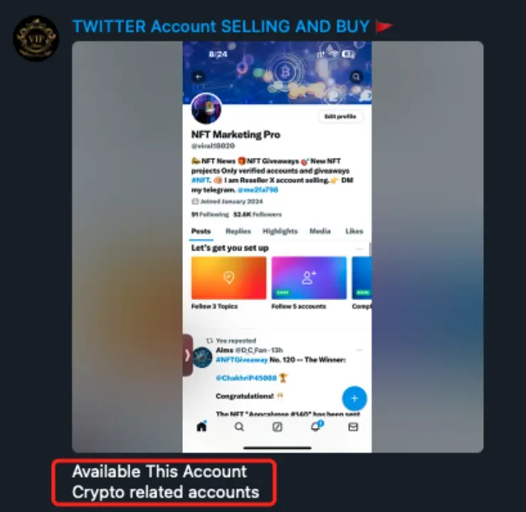 Sahte X (eski adıyla Twitter) hesapları, çeşitli Telegram gruplarında satılıyor. Saldırganlar, takipçi sayısına ve kayıt tarihine göre profilleri seçebiliyor. Satılan sayfaların çoğu kripto endüstrisi ve kripto influencer’ları ile ilgili. Uzmanlar, bazı web sitelerinin sahte X hesapları sattığını da belirtti.