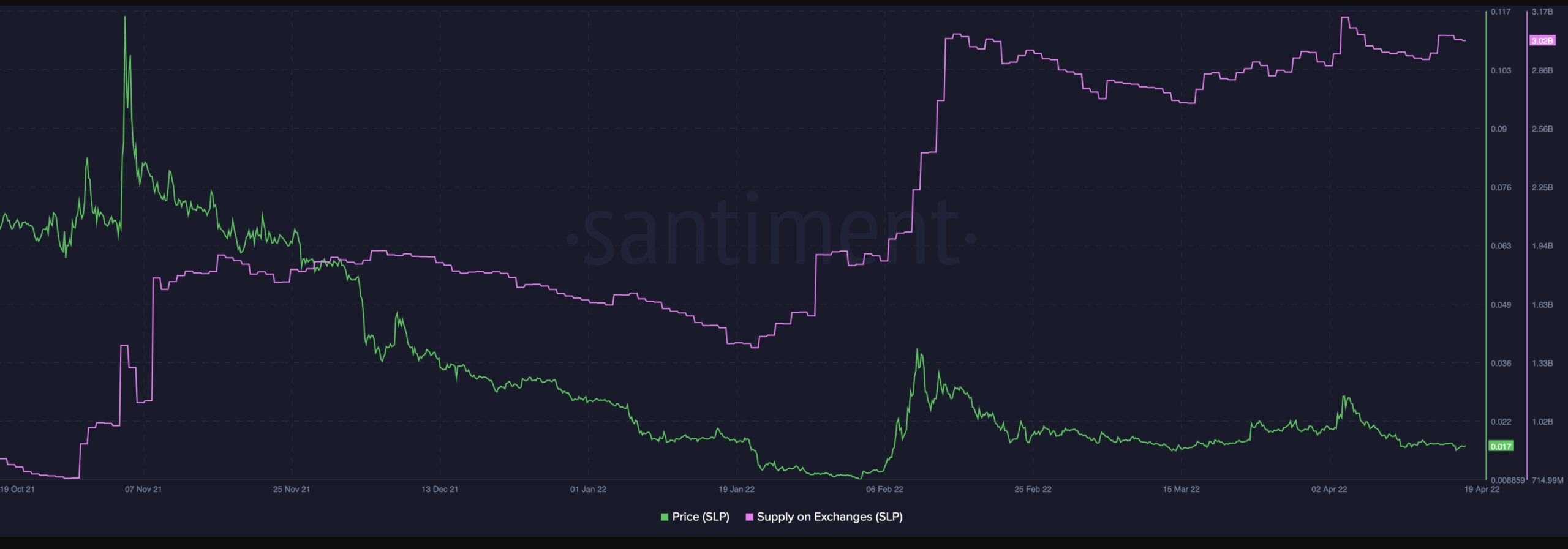 “On-chain veriler satışların arttığını ortaya koydu. Aslında, birkaç güçlü fiyat rallisine rağmen, borsa arzı 2021’in sonlarında görülen seviyelerin çok üzerinde. Bu, kullanıcıların kayıplarını azaltmak için SLP’lerini sattıklarını gösterir.”