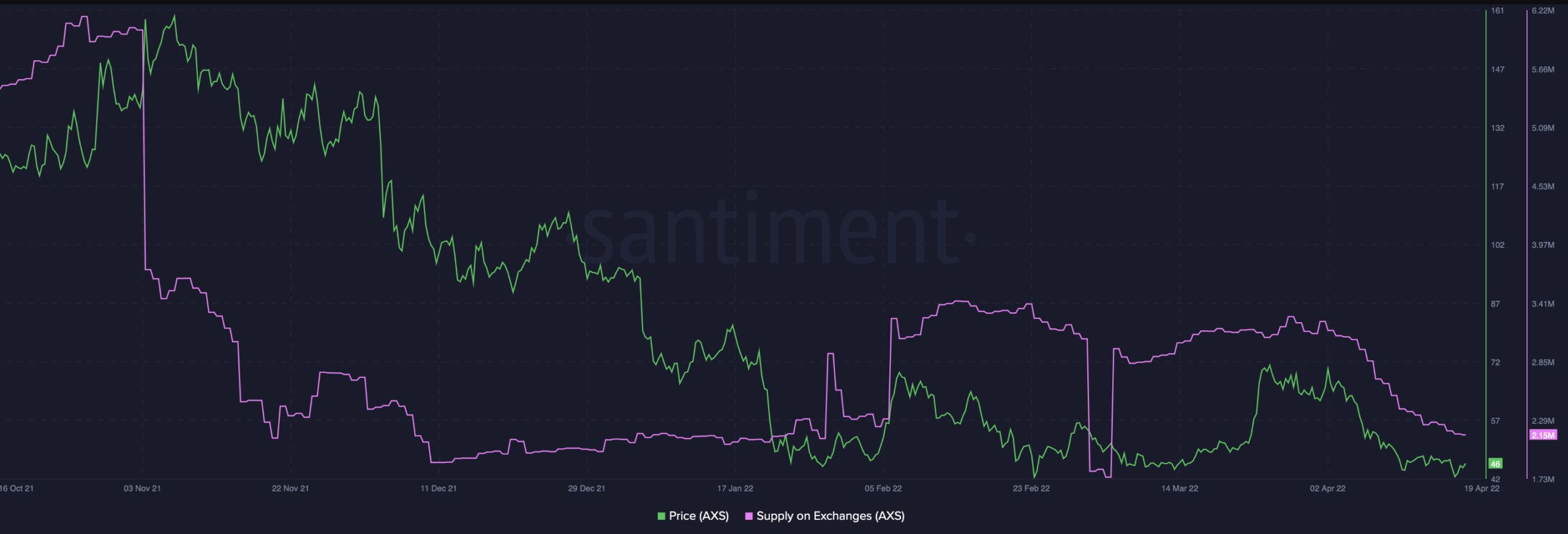 Gelen verilere göre, borsalardaki AXS arzının nisan ayı boyunca düştüğü görülüyor. Bu noktada Ronin Daily, AXS’in ödül yapılarının değiştiğini ve bunun ekosistem güncellemerine pozitif katkısı olduğunu bildiriyor. On-chain veri analiz firması Santiment, borsaların Axie Infinity arzı ile AXS fiyatını karşılaştıran bir grafik yayımladı. Ancak grafikte arzın azalmasına rağmen yeterli fiyat artışının yaşanmadığı görülüyor.