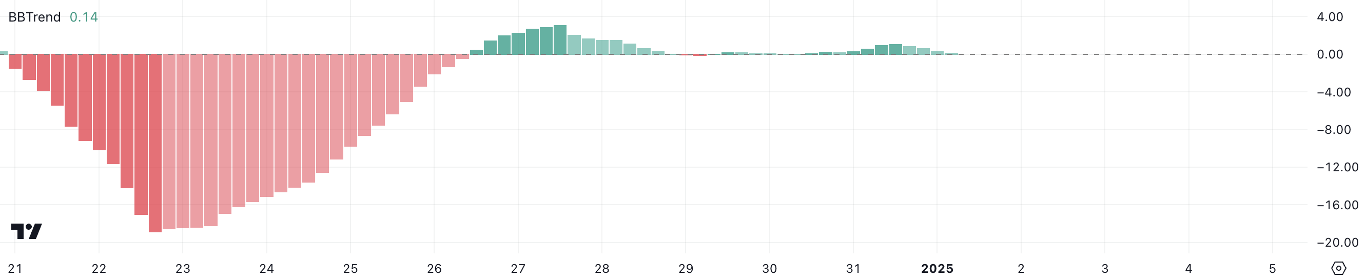 BBTrend, Bollinger Bantları’ndan türetilmiş olup, bir trendin gücünü ve yönünü ölçer. Pozitif değerler yukarı yönlü ivmeyi, negatif değerler ise aşağı yönlü ivmeyi gösterir. Solana BBTrend artık negatif bölgede olmasa da, 0,14 civarındaki düşük pozitif okuma, zayıf bir piyasa ortamını yansıtıyor.