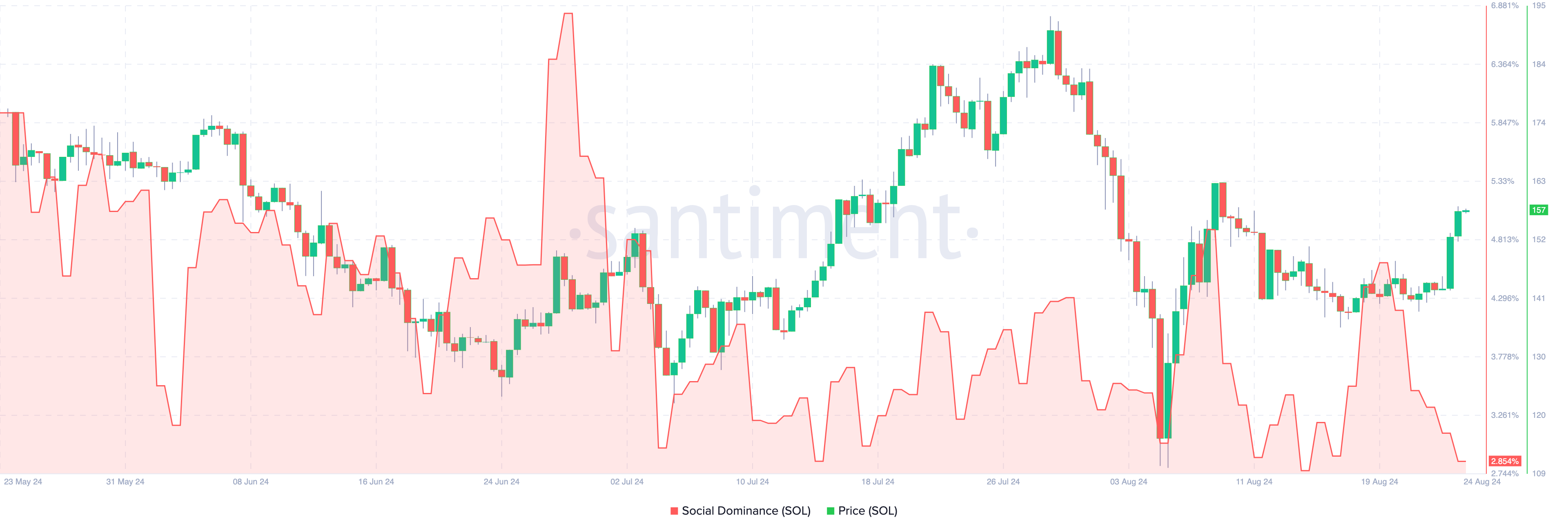 Şu anda SOL’un fiyatı 158 dolar seviyesinde ve 11 Ağustos’tan bu yana en yüksek noktasında. Bu yükselişe rağmen, Solana’nın sosyal hakimiyeti düştü.
