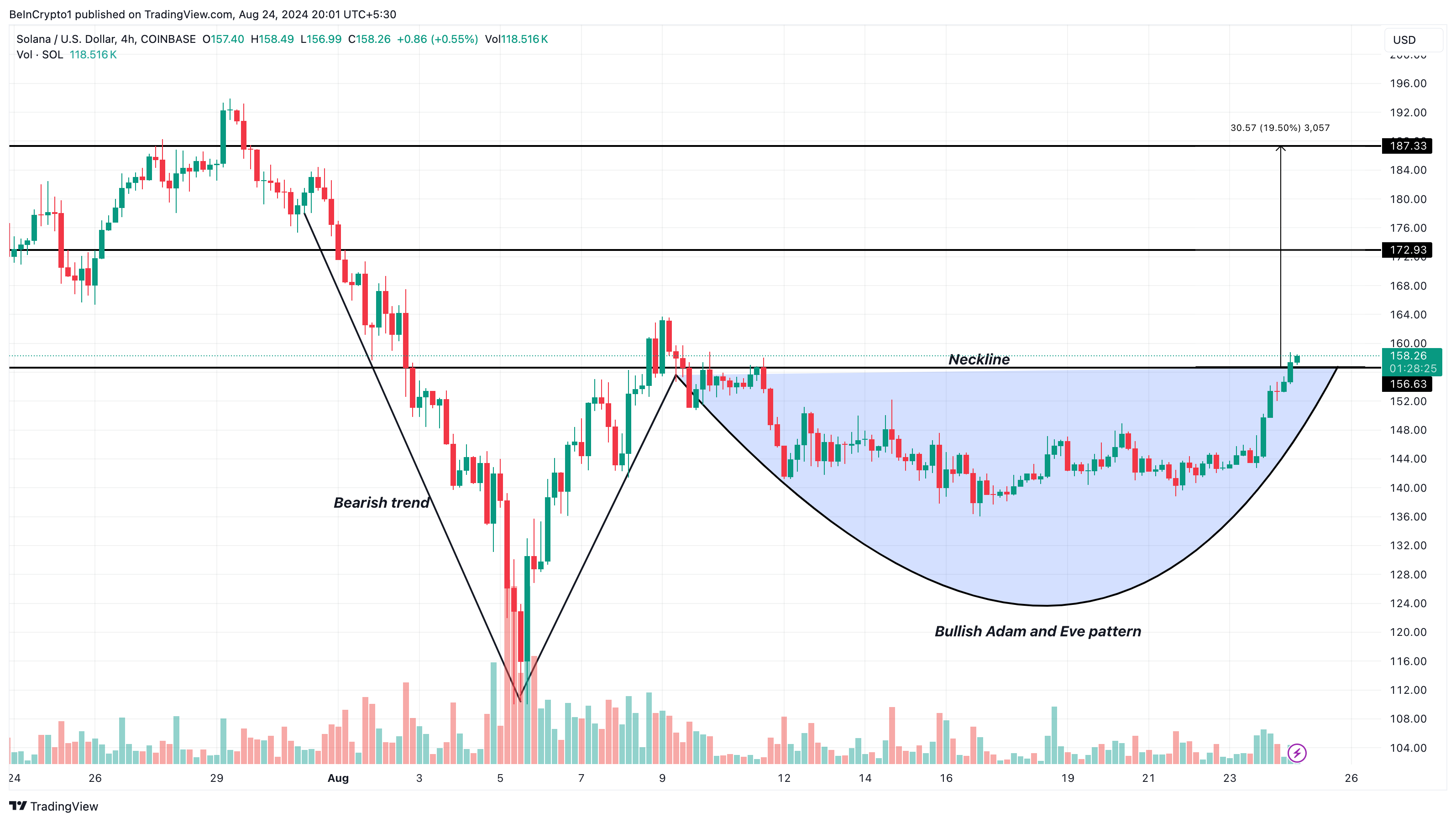 Öte yandan, 4 saatlik grafikte, SOL fiyatı boğa eğilimli Adam ve Eve formasyonu oluşturdu. Bu desen, V şeklinde bir dip (Adam) ile başlayıp U şeklinde bir konsolidasyon dönemiyle devam eder ve yeni bir yükseliş trendinin başlangıcını işaret eder.
