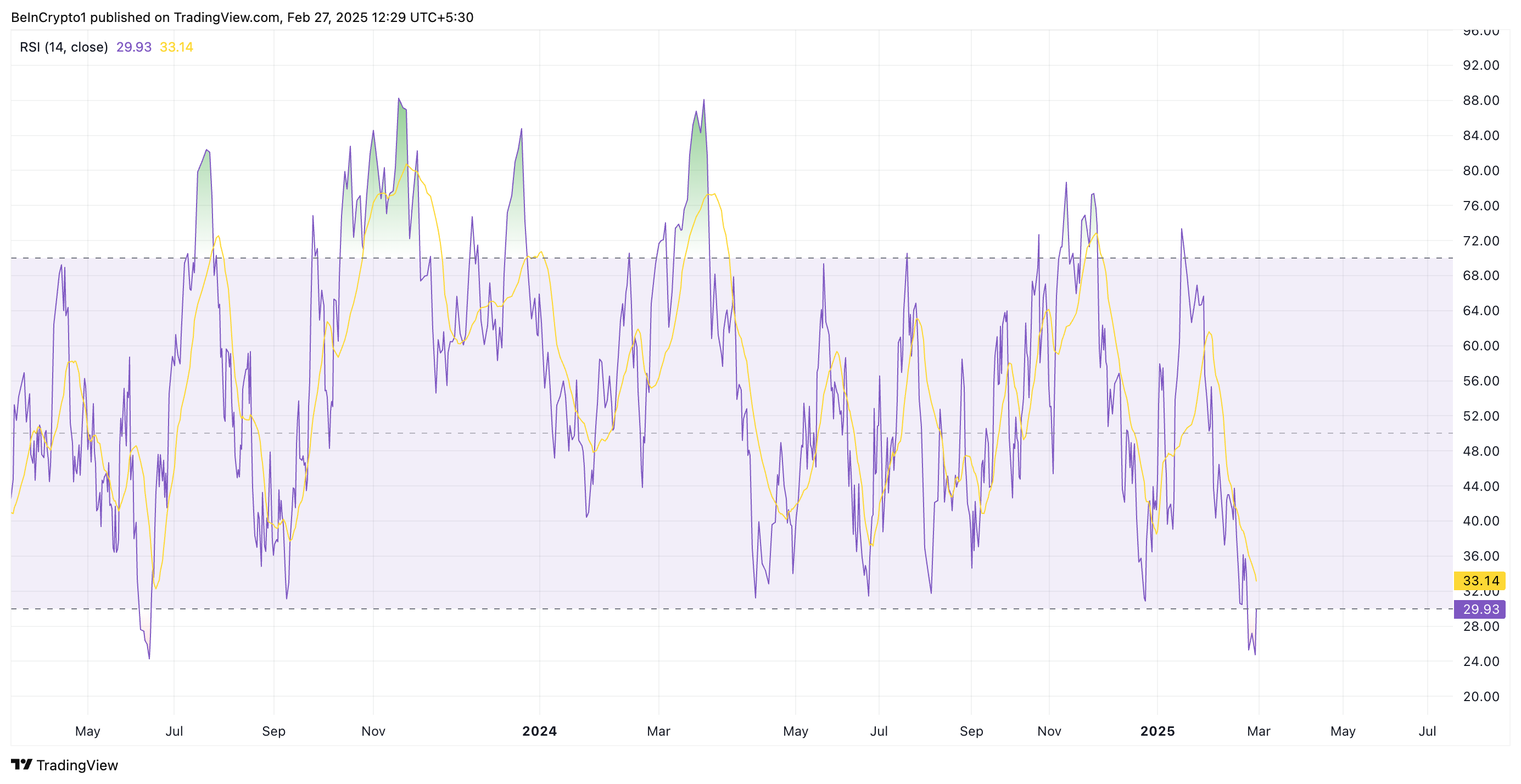 Bir varlığın RSI’si 30’un altına düştüğünde, aşırı satılmış kabul edilir. Bu genellikle trader’ların fiyat düşüşlerinde alım fırsatları aramasıyla potansiyel bir tersine dönüş veya fiyat sıçraması sinyali verir. Tarihsel olarak, bu tür aşırı satım koşulları keskin sıçramalardan önce gelmiştir.