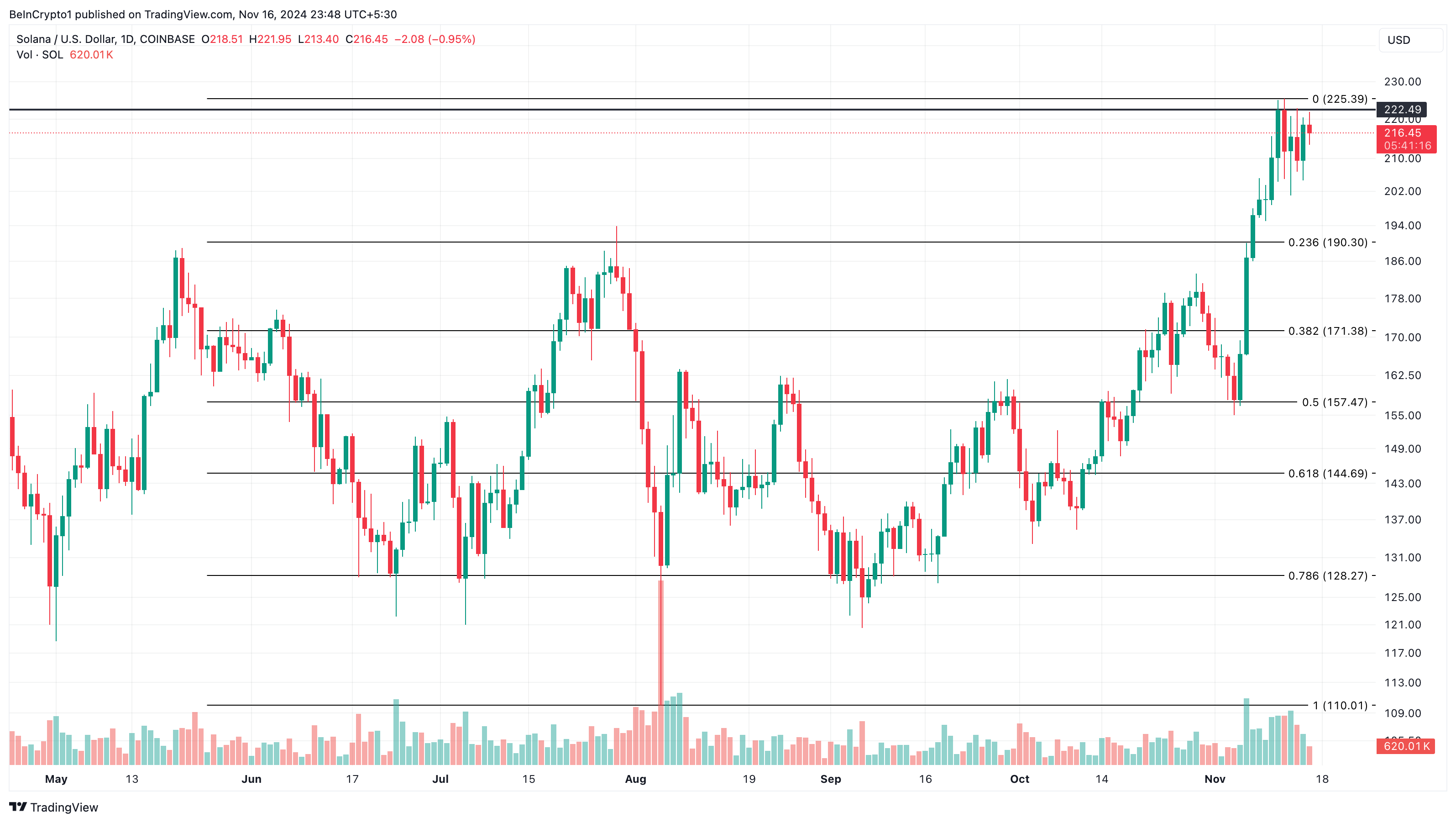 Günlük grafikte, Solana ayıları fiyat 222,49 dolara ulaştığında geri çekilme yaşattı. Bu geri çekilme, altcoin’in 300 dolar seviyesine ulaşma umutlarını azalttı. Yukarıda bahsedildiği gibi, hacim de azaldı ve bu grafikte de doğrulandı.