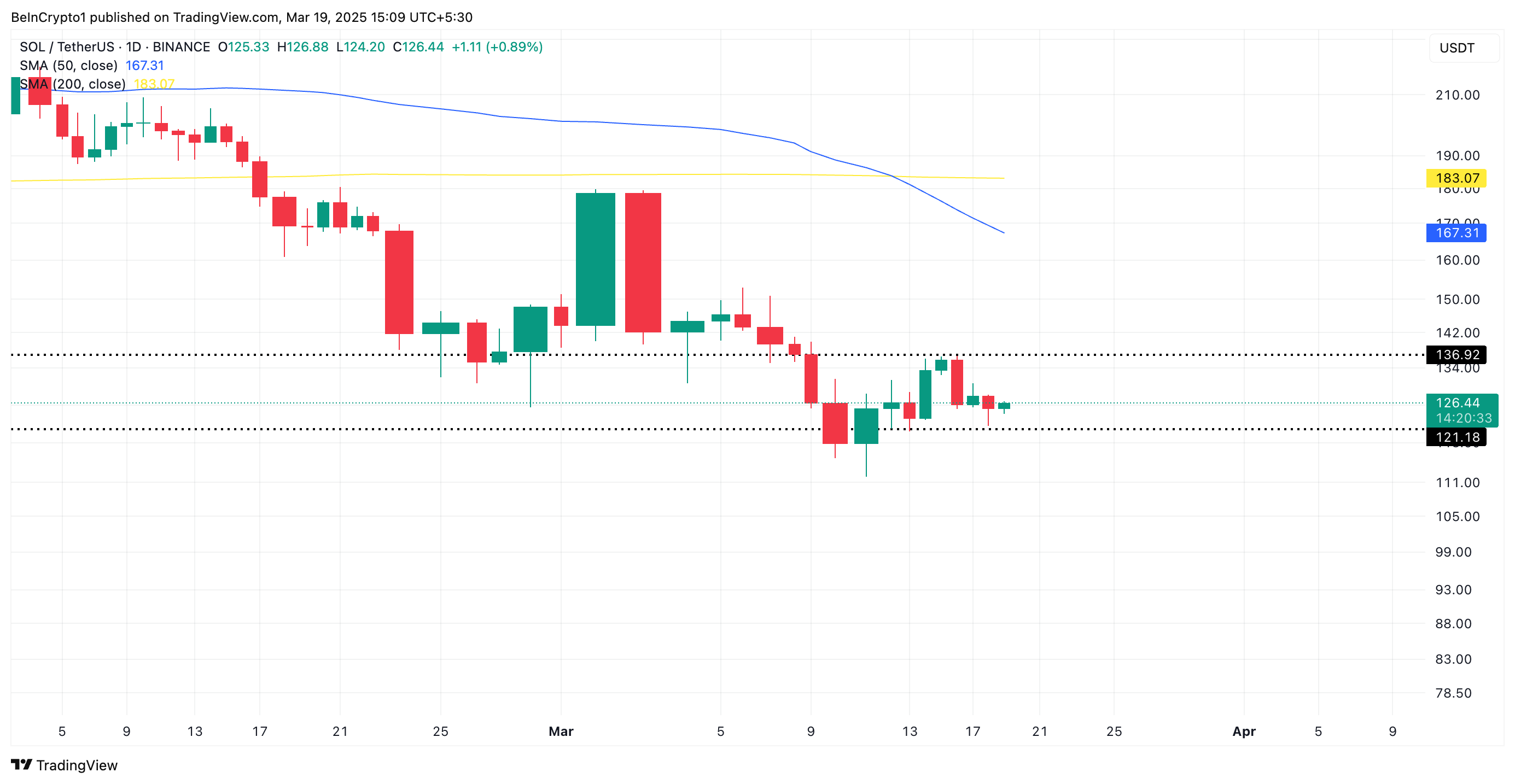 SponsoredBu, yükseliş trendinden düşüş trendine bir geçişi doğrular ve zayıflayan momentum ile artan aşağı yönlü riski işaret eder. Model ortaya çıktığından beri, SOL’un fiyatı dar bir aralıkta işlem gördü. O zamandan beri 136,92 Dolar’da oluşan direnç ve 121,18 Dolar destek tabanı arasında dalgalandı.