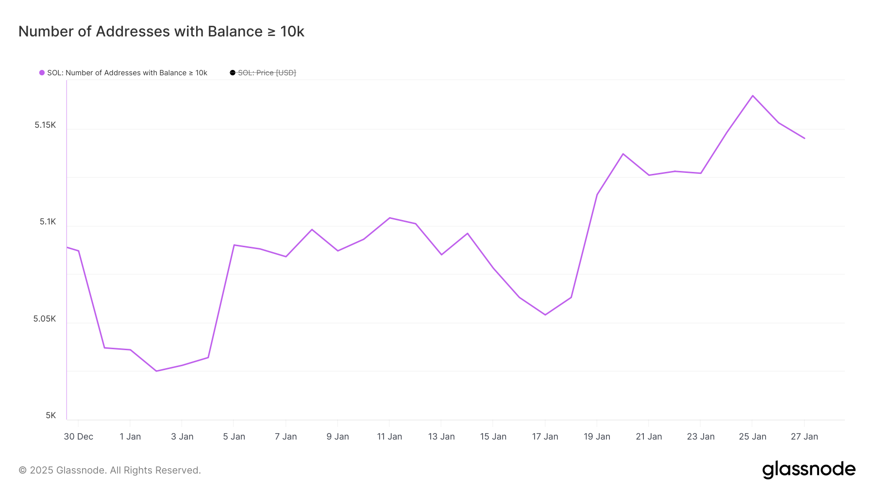 En az 10.000 SOL tutan adresler – SOL balinaları – sayısı önemli ölçüde arttı ve 17 Ocak’ta 5.054’ten 25 Ocak’ta tüm zamanların en yüksek seviyesi olan 5.167’ye yükseldi.