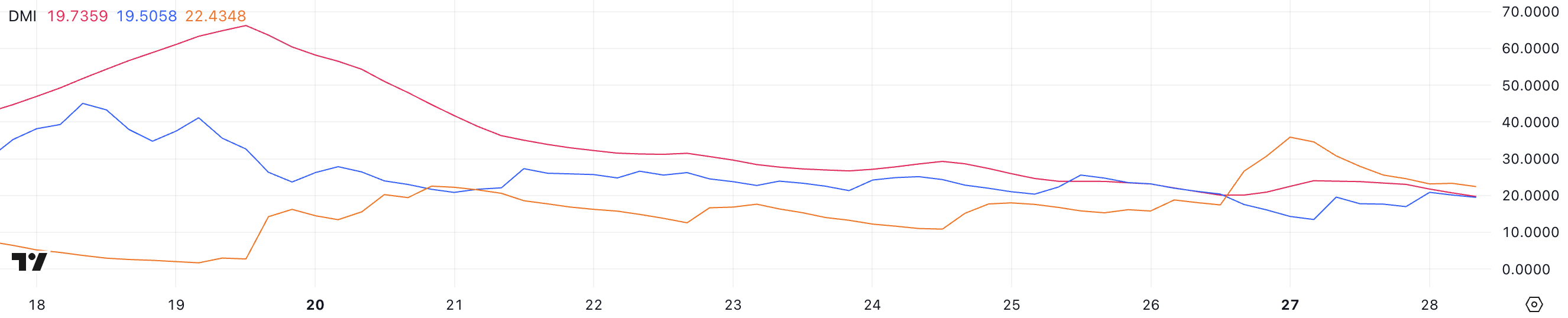 Solana Yönlü Hareket Endeksi (DMI), ADX’in şu anda 19,7 olduğunu ve son üç günde 20 ile 23 arasında dalgalandığını gösteriyor. Ortalama Yön Endeksi (ADX), trendin yönünden bağımsız olarak gücünü ölçer.