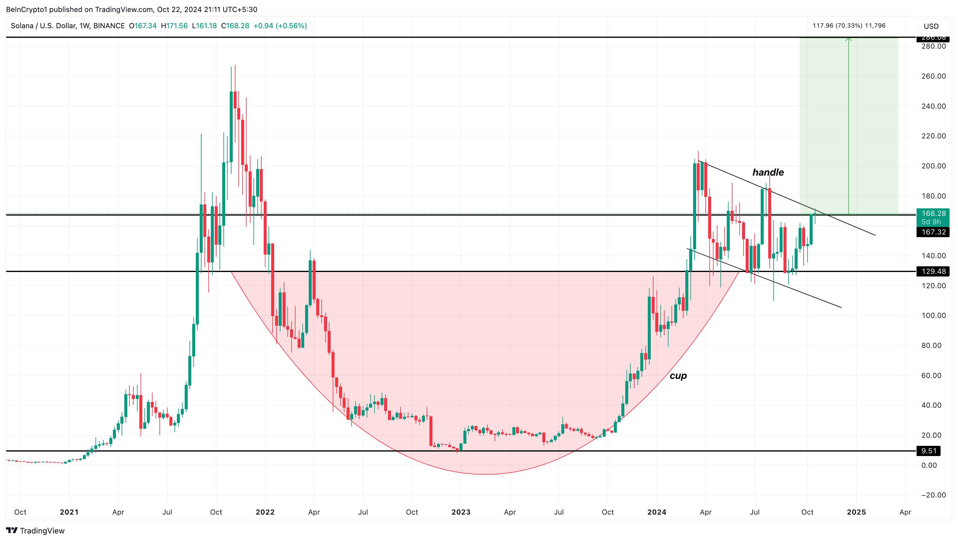 Bu çıkış gerçekleşirse, fiyat, fincanın dibinden boyun çizgisine kadar olan maksimum mesafe kadar yükselebilir. SOL için, token boyun çizgisinin üzerine çıktı ve 167 doları aştı. Dolayısıyla, altcoin’in değeri %70 artabilir ve muhtemelen 285 dolara ulaşabilir.