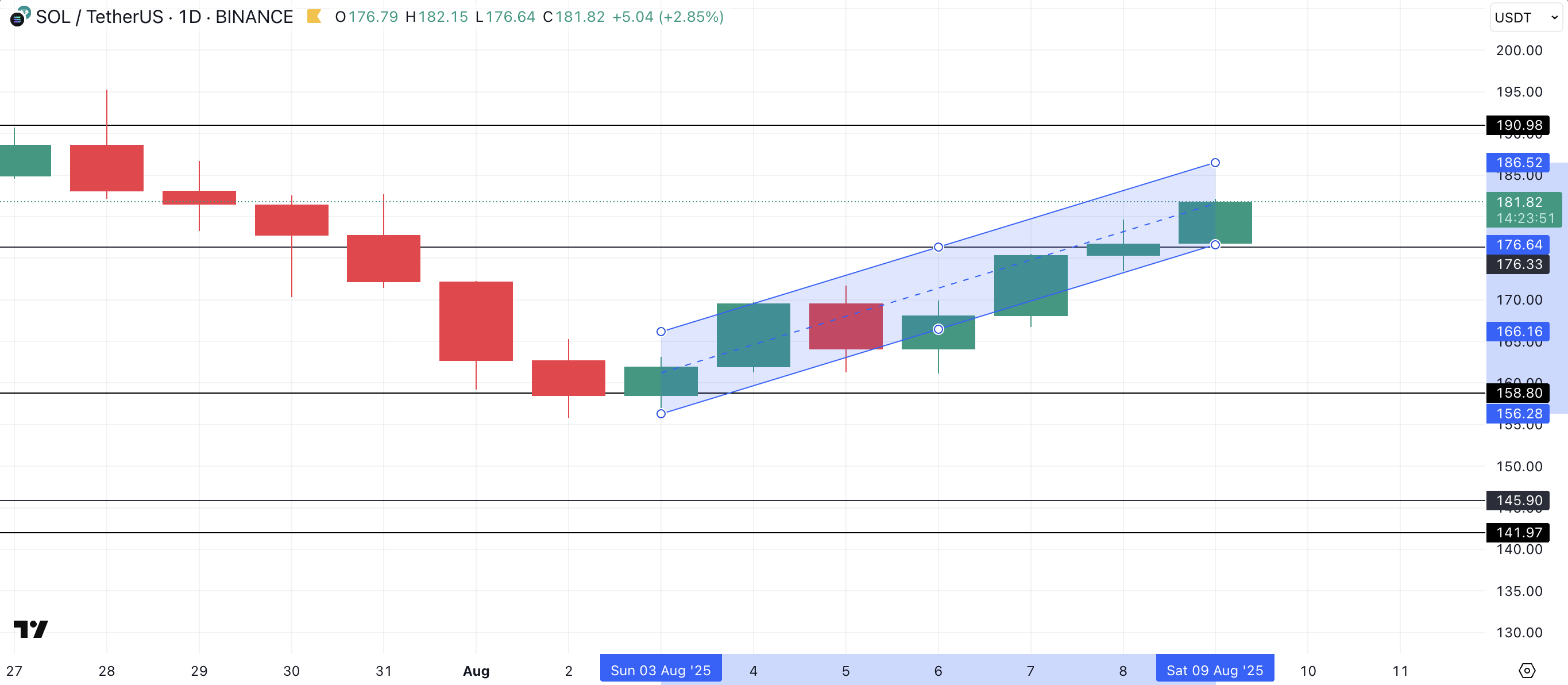 Bu yazı itibarıyla, SOL 181,82 Dolar seviyesinde işlem görüyor ve yükselen paralel kanalının üst sınırı olan 186,52 Dolar direnç seviyesinin hemen altında yer alıyor.
