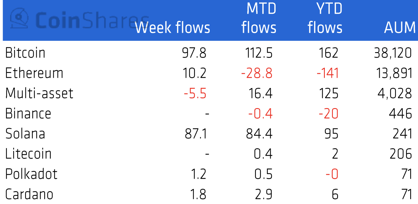 “Solana, AuM’nin %36’sını temsil eden toplam 87 milyon ABD doları ile rekor düzeydeki en büyük yatırım haftasını gördü. AuM şu anda 241 milyon ABD Doları seviyesinde bulunuyor ve bu da onu en büyük 5. yatırım ürünü ve Ethereum dışındaki en büyük altcoin yapıyor.”