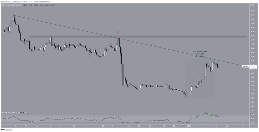 Solana fiyatı, 13 Ağustos’tan bu yana alçalan direnç çizgisi altında değer kaybediyor. Bu çizgi kasım başlarında fiyatı reddetti. Ardından 29 Aralık tarihinde 8 dolara kadar düşüş gerçekleşti. SOL bu noktada sıçradı ve yüzde 225 artış gösterdi.