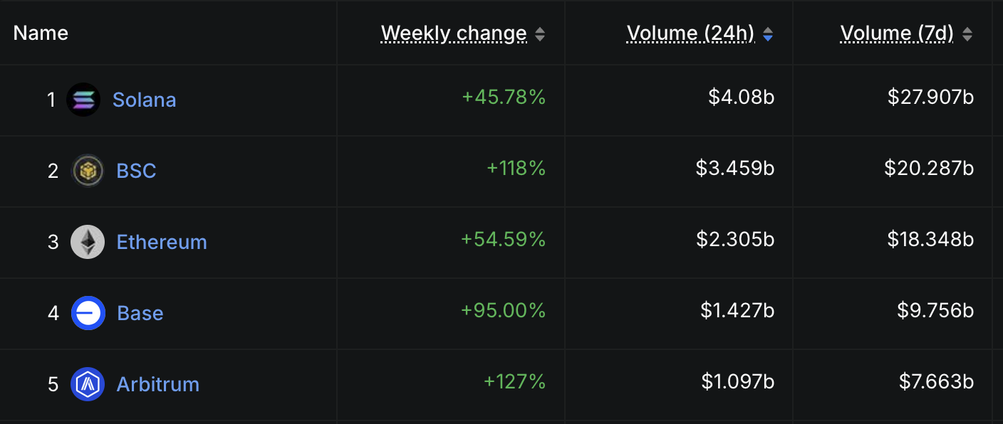SponsoredSadece son yedi günde, Solana 27,9 milyar Dolar DEX hacmi kaydetti ve BNB Chain, Ethereum, Base ve Arbitrum’u geride bıraktı.