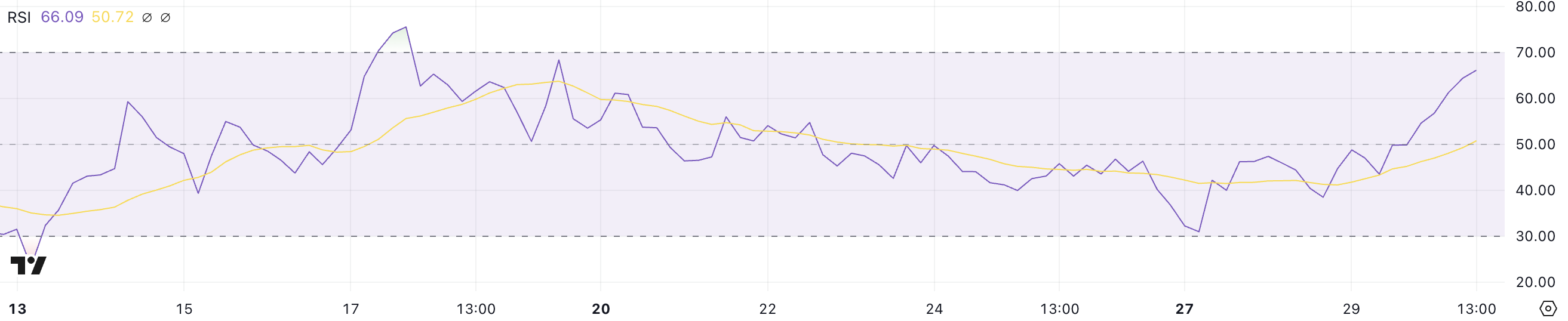 SPX6900 RSI, son %30’luk fiyat artışının ardından sadece bir günde 43,5’ten 66’ya yükseldi. Bu artış, SPX’i piyasadaki en büyük 6. meme coin arasında yerleştirdi. RSI (Göreceli Güç Endeksi), fiyat hareketlerinin hızını ve büyüklüğünü 0 ile 100 arasında ölçen bir momentum göstergesidir.