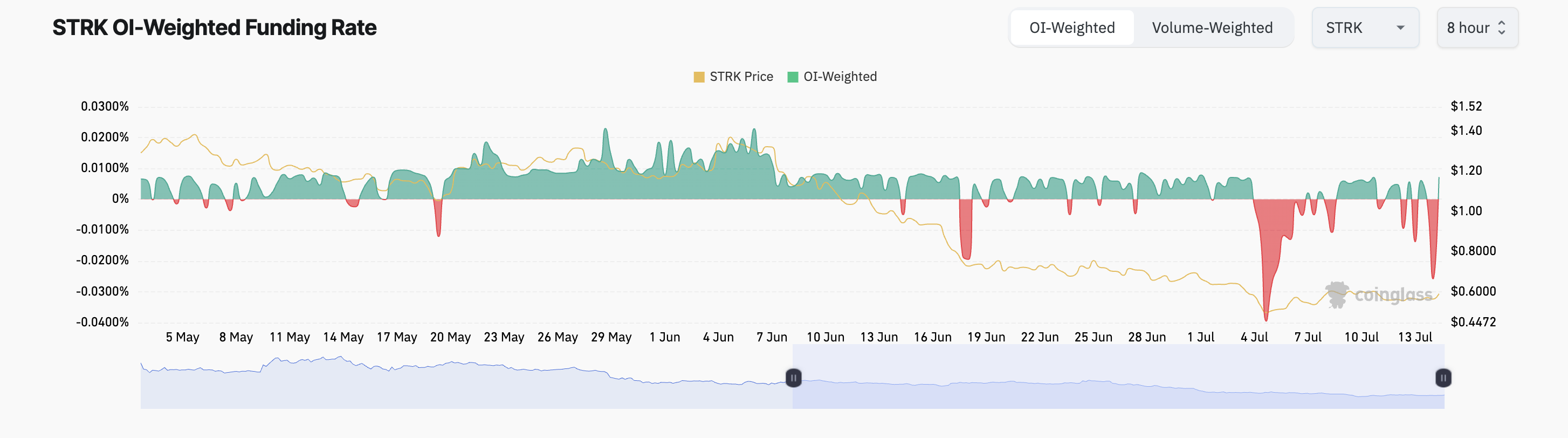 Bununla birlikte, birçok türev tüccarı, STRK’nın mevcut rallisinin sürdürülebilir olduğuna ikna olmuş değil. Bu, daha fazla kısa pozisyon talep etmelerine neden oldu. Bu, incelenen dönemde ağırlıklı olarak negatif olan tokenin fonlama oranından elde edilen okumalara dayanmaktadır.
