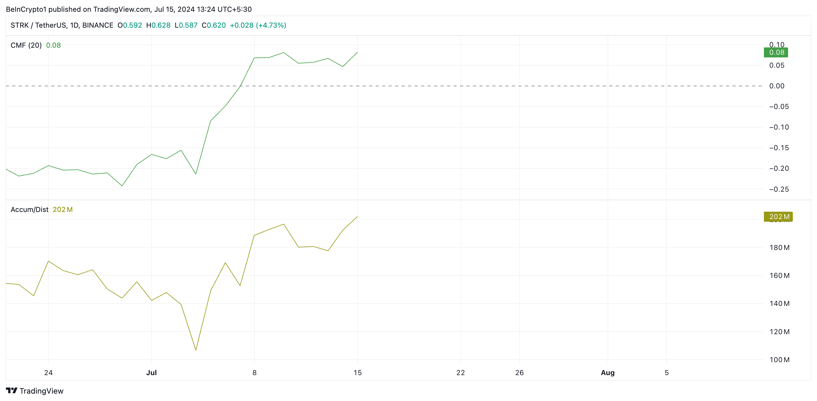Bir günlük grafikte değerlendirildiği üzere, STRK’nın önde gelen teknik göstergelerinden bazıları uzun süreli bir ralli olasılığına işaret ediyor. Örneğin, Chaikin Para Akışı (CMF) fiyatı ile yükseliş eğilimi gösterdi.