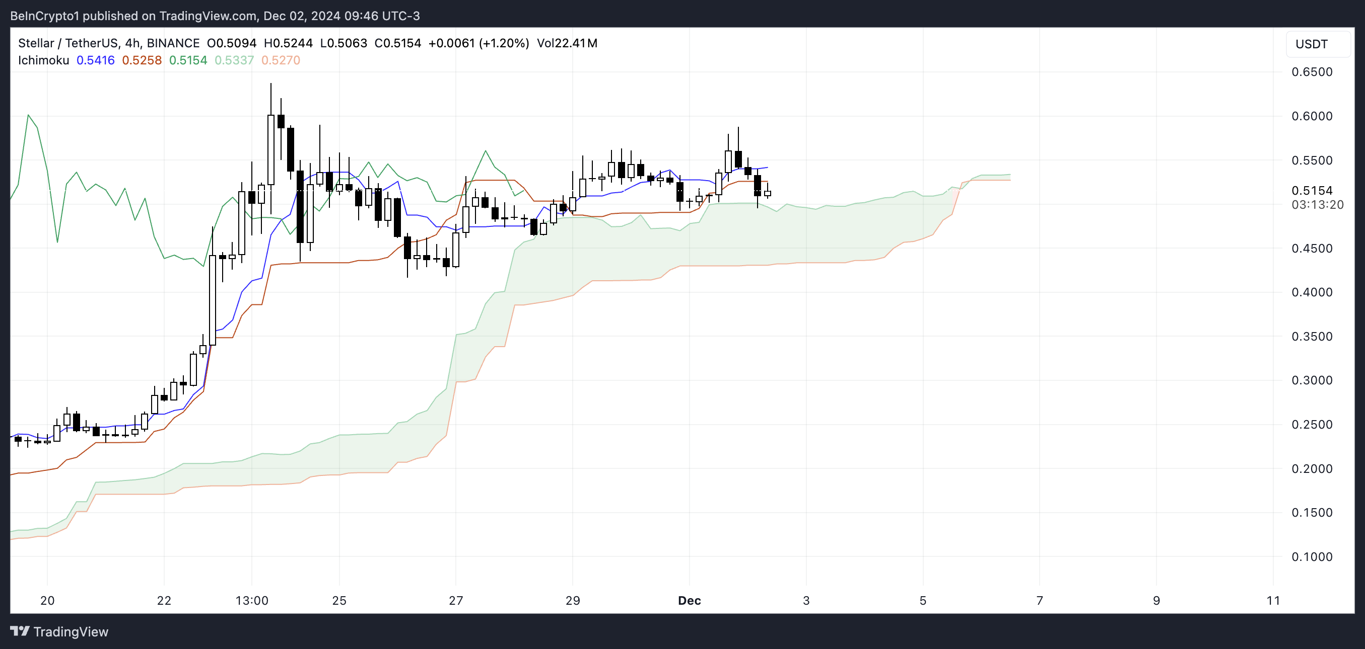 Bu Stellar için Ichimoku Bulutu grafiği, fiyat hareketinin şu anda bulutun yakınında konumlandığını ve destek testi potansiyelini gösteriyor.