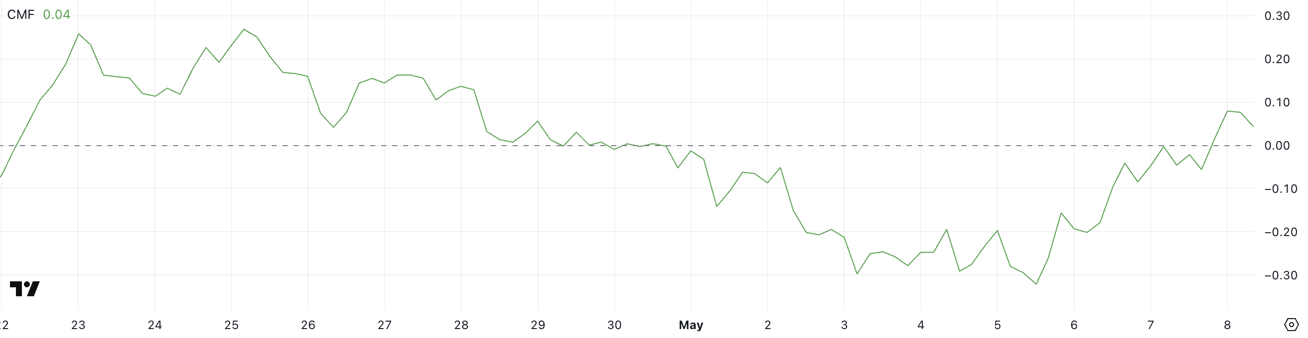 Sıçrama cesaret verici olsa da, CMF 28 Nisan’dan bu yana kilit 0,10 seviyesinin üzerine çıkmadı, bu da sürdürülebilir sermaye girişlerinin şu an için sınırlı kaldığını gösteriyor.