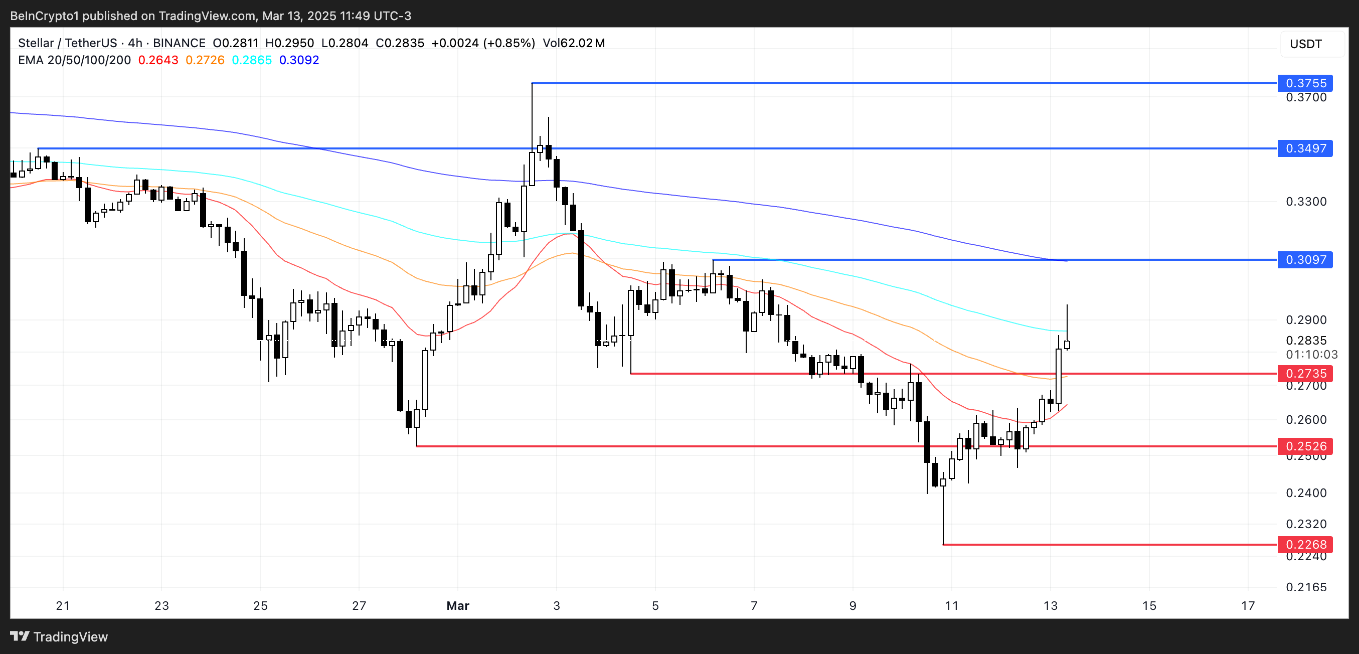 Stellar’ın EMA çizgileri hala düşüş trendini gösteriyor, kısa vadeli EMA’lar uzun vadeli olanların altında konumlanmış durumda. Ancak, kısa vadeli EMA’lardaki son yukarı yönlü hareket, momentumun değişebileceğini ve trendin tersine dönme olasılığını artırıyor.