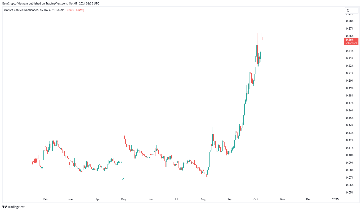 Son iki ayda SUI.D, %270 artarak yeni bir zirve olan %0,27’ye ulaştı. Şu anda %0,26’ya gerilemiş durumda. Bu, Bitcoin hakimiyetinin %56’nın üzerinde kaldığı bir dönemde, çoğu altcoin’in piyasa değeri payında düşüşler yaşadığı bir zamanda gerçekleşti.