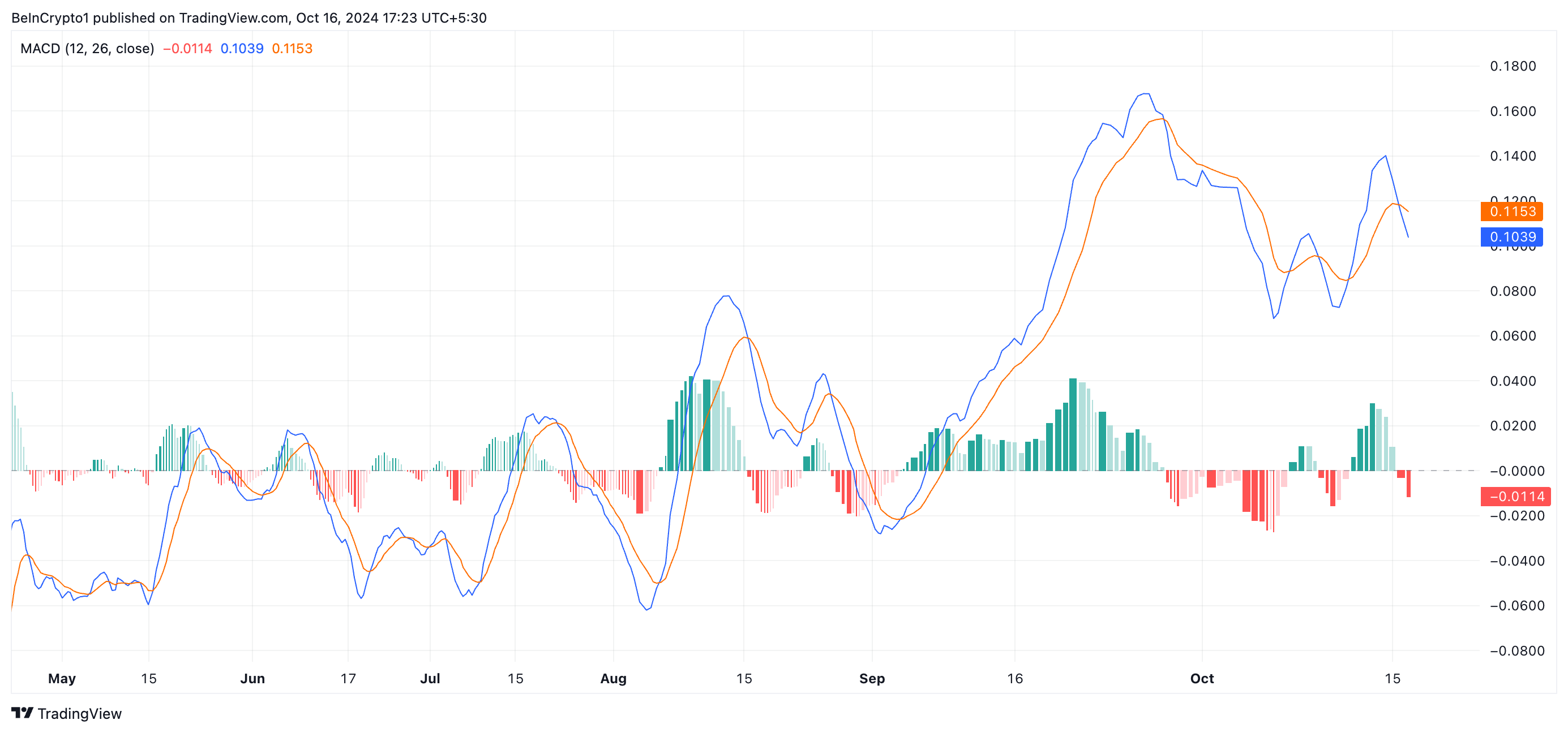 SUI’nin hareketli ortalama yakınsama/ıraksama (MACD) okumaları bu ayı görünümünü doğruluyor. MACD çizgisi (mavi) yakın zamanda sinyal çizgisinin (turuncu) altına düştü, bu da piyasadaki duyarlılığın boğadan ayıya döndüğünü işaret ediyor.