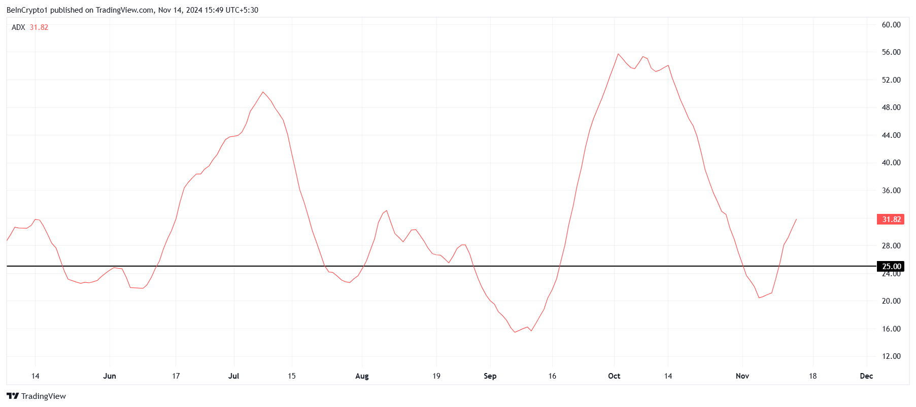 Makro perspektiften bakıldığında, SUI’nin ivmesi güçlü kalmaya devam ediyor. Trend gücünün önemli bir göstergesi olan Ortalama Yönlü İndeks (ADX), şu anda 25,0 eşiğinin üzerinde bulunuyor. Mevcut trendin önemli bir güç kazandığını işaret ediyor. SUI için bu trend yukarı yönlü olup, son fiyat hareketlerinde görülen genel boğa hissiyatıyla uyumlu. ADX 25,0’ın üzerindeyken, SUI’nin sürekli büyümesi olasılığı artıyor, daha fazla kazanç spekülasyonunu körüklüyor.
