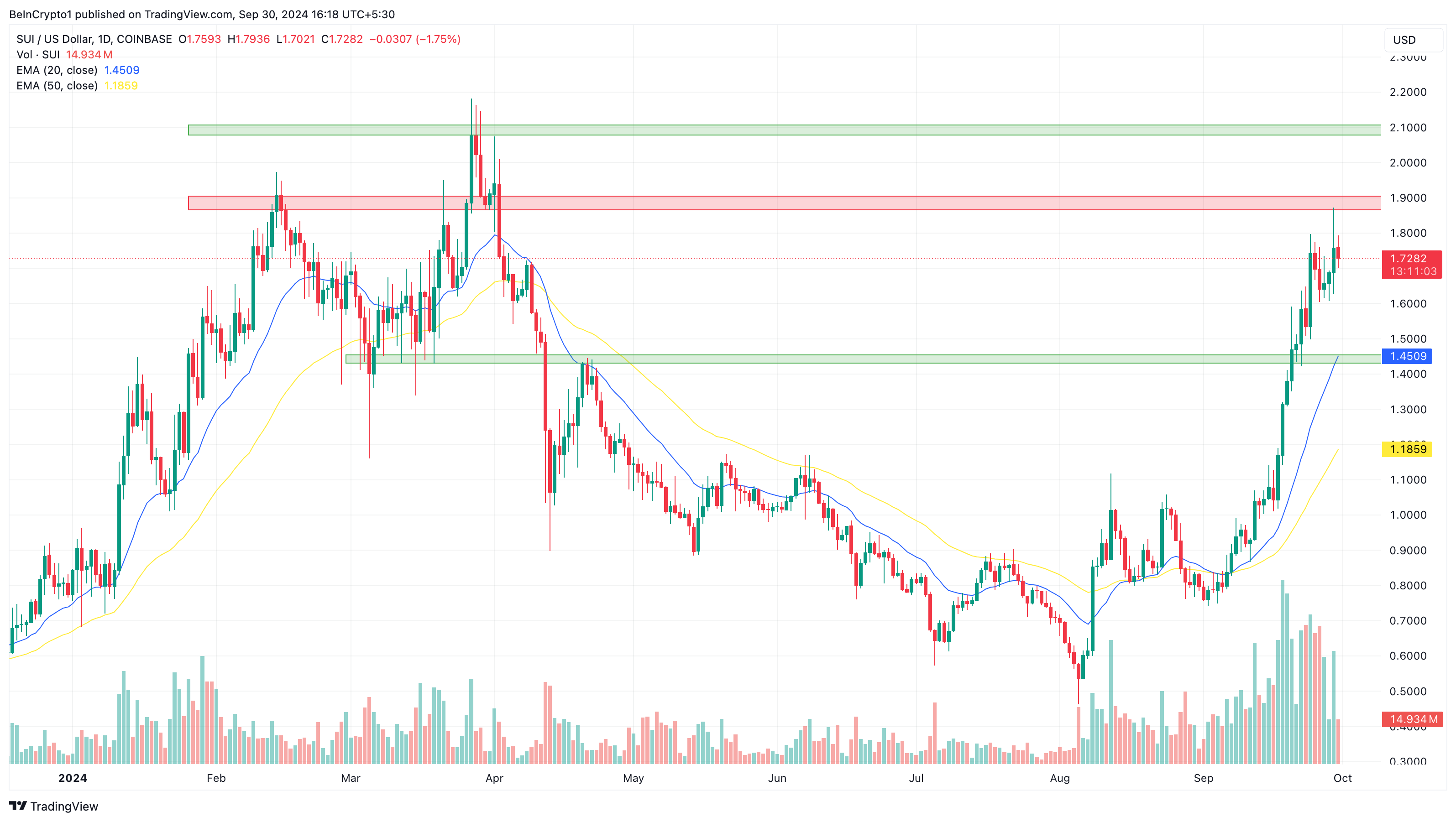 Günlük SUI/USD grafiğine daha yakından bakıldığında, altcoinin olağanüstü güç göstermeye devam ettiği görülüyor. Ancak trader’lar geçmişten beri SUI’nin fiyatı için kritik bir seviye olan 1,90 dolar bölgesine dikkat etmelidir.
