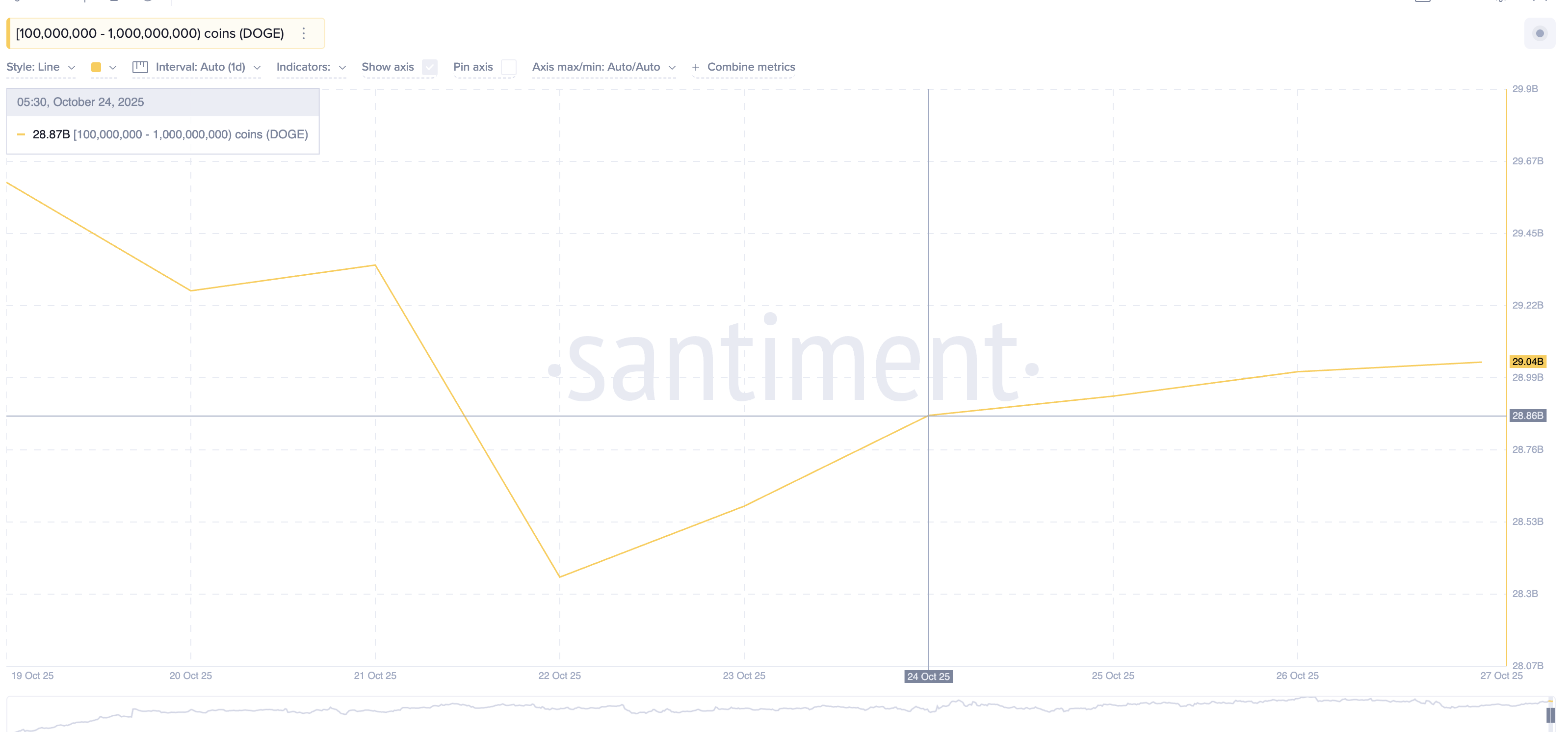 İlginç bir şekilde, Dogecoin balinaları sessizce birikim yapıyor. 100 milyon ile 1 milyar DOGE arasında bakiyeye sahip olanlar, son 48 saatte arzlarını 28,87 milyardan 29,04 milyar DOGE’ye çıkardı.
