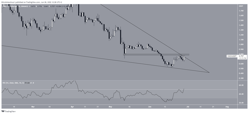 1inch (1INCH), haziran ayının dip seviyelerinden yüzde 48’lik bir sıçrama gösterdi ve şu anda uzun vadeli alçalan takozdan çıkış yapmaya çalışıyor.