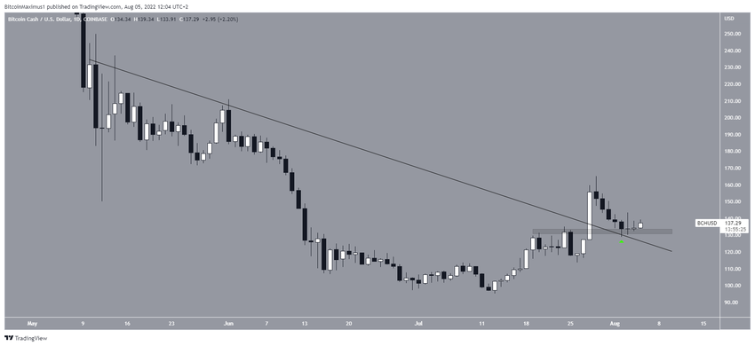 BCH, 13 Temmuz’dan bu yana yükseliş gösteriyor ve 28 Temmuz’da alçalan direnç çizgisinden çıkış yaptı. 5 gün sonra ise bu çizgiyi destek olarak test edip onaylamak için geri döndü (yeşil simge). Ardından gerçekleşen sıçrama, 133 dolar yatay bölgesini de destek olarak onayladı.