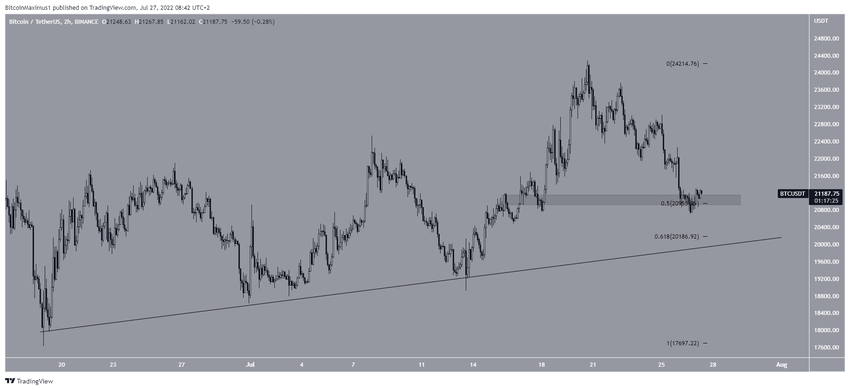 6 saatlik grafik, lider kripto para Bitcoin’in (BTC) 19 Haziran’dan bu yana yükselen destek çizgisi üzerinde artış yaşadığını gösteriyor. Şu anda bu destek çizgisi 20.200 dolarda yer alıyor ve 0.618 Fib düzeltme destek seviyesi ile de uyum gösteriyor.