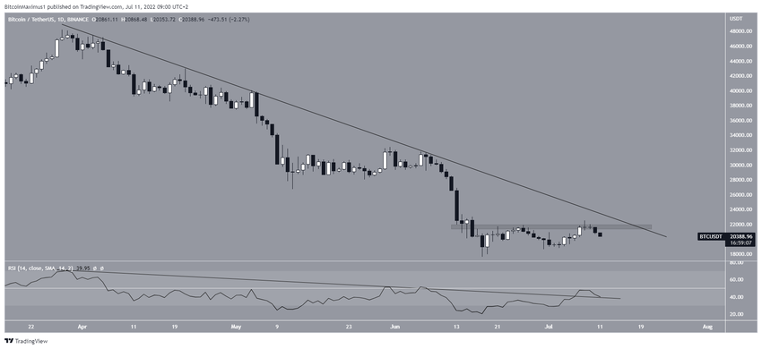 Günlük grafik ise bize karışık sinyaller veriyor. Fiyat, mart ayının sonlarından bu yana alçalan direnç çizgisinin altında hareket ediyor. 8 Temmuz günü, BTC bu direnç çizgisine ulaşmakta başarısız oldu ve 21.700 yatay direnç bölgesinden red yedi. Bu yatay çizgi ise artık alçalan direnç çizgisi ile örtüşüyor.