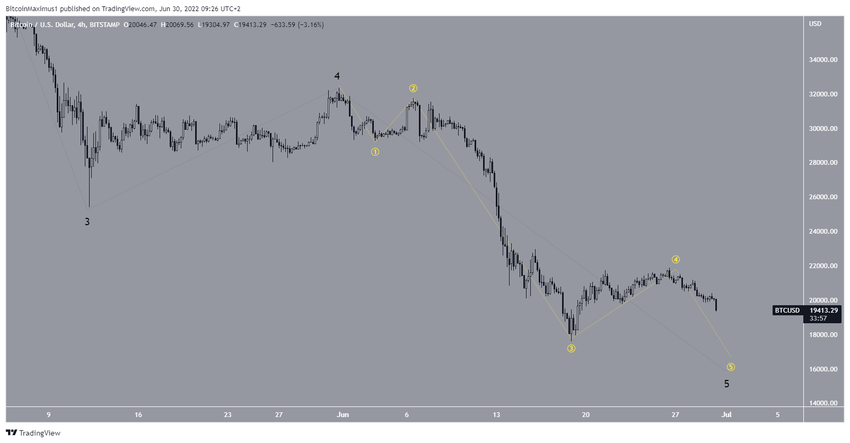 Olumsuz dalga sayımına göre haziran ayının başından bu yana tüm aşağı yönlü hareketin, beş dalgalı bir aşağı yönlü hareketin dördüncü dalgasının (beyaz) bir parçası olduğunu ve sonunda tersine dönmeden önce fiyatın 16.000 dolara düşeceğini gösteriyor.
