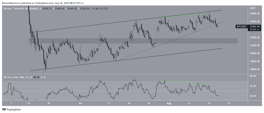 Ayrıca, Bitcoin bu kanalın direnç çizgisinde negatif uyumsuzluk üretti (yeşil çizgi). Ardından, 12 Temmuz’dan bu yana var olan yükselen destek çizgisinden kırılım gerçekleşti (kesik çizgi).