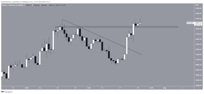 Bitcoin, bu noktadan sonra kademeli olarak artışa başladı ve 18 Temmuz günü alçalan direnç çizgisinden çıkış yapmayı başardı. Ardından fiyat bir miktar geri çekilme yaşadı ve 21.600 dolar yatay bölgesini destek olarak onayladı. Bundan sonra yükseliş hızı artış gösterdi. Şimdiye kadar, 24.442 dolarda bir tepe oluştu.