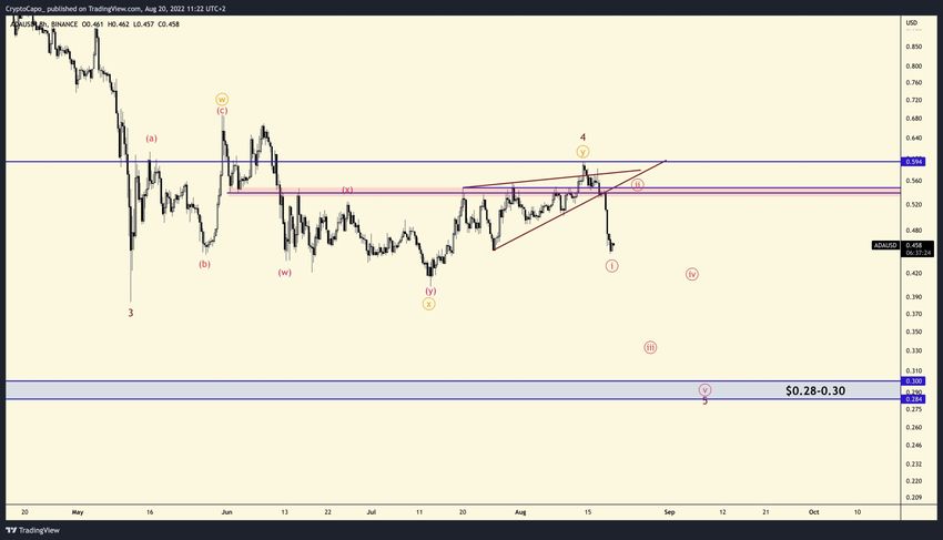 Ünlü kripto para trader’ı @CryptoCapo_ ADA grafiği paylaştı. Başarılı yatırımcıya göre, fiyat yakın zaman içinde beş dalgalı düşüş hareketini tamamlamış olacak.