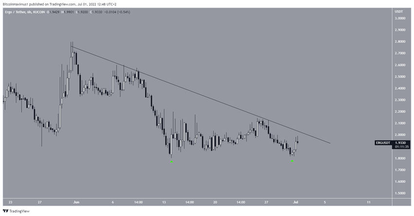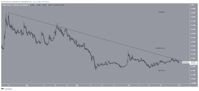 Bu altcoin 20 Mart’tan bu yana alçalan direnç çizgisinin alt tarafında değer kaybediyor. OGN fiyatı, en sonuncusu 28 Haziran’da olmak üzere bu çizgiden birçok kere red yedi.