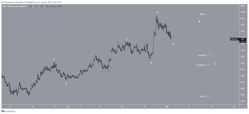 En olası dalga sayımı analizine göre UNI, beş dalgalı yükseliş hareketini tamamladı ve şu anda A-B-C düzeltme yapısını tamamlama sürecinde bulunuyor. Eğer bu senaryo doğru ise, şu anda A dalgasının dibine doğru yaklaşmış demektir.