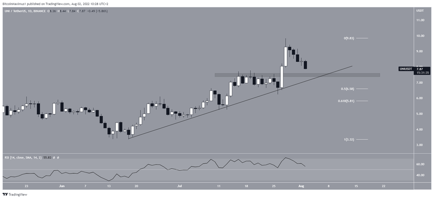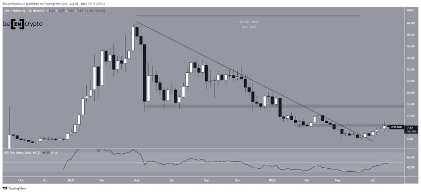 UNI, Mayıs 2021’de 45 dolara ulaştıktan sonra alçalan direnç çizgisinin alt tarafında değer kaybediyordu. Bu düşüşler sonucunda, haziran ayında 3,33 dolarda bir dip oluştu. Aynı zamanda haftalık RSI da tarihin en düşük noktasına geriledi (yeşil simge).