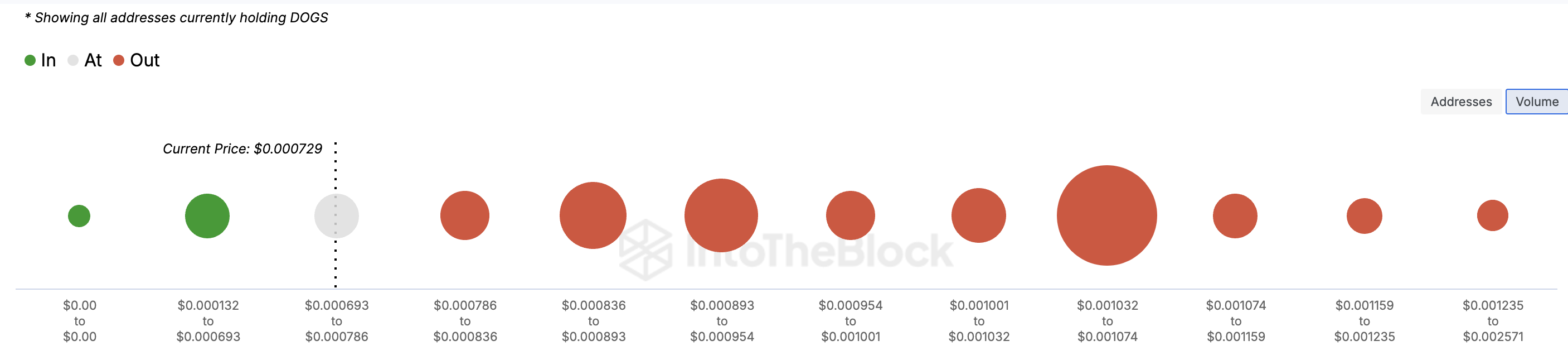 Global In/Out of Money (GIOM) göstergesine göre, DOGS sahipleri şu anda neredeyse %99’u zarar içinde. 0,00079 ile 0,0013 dolar arasında DOGS satın alan milyarlarca adres şu anda token’ı zararla tutuyor.