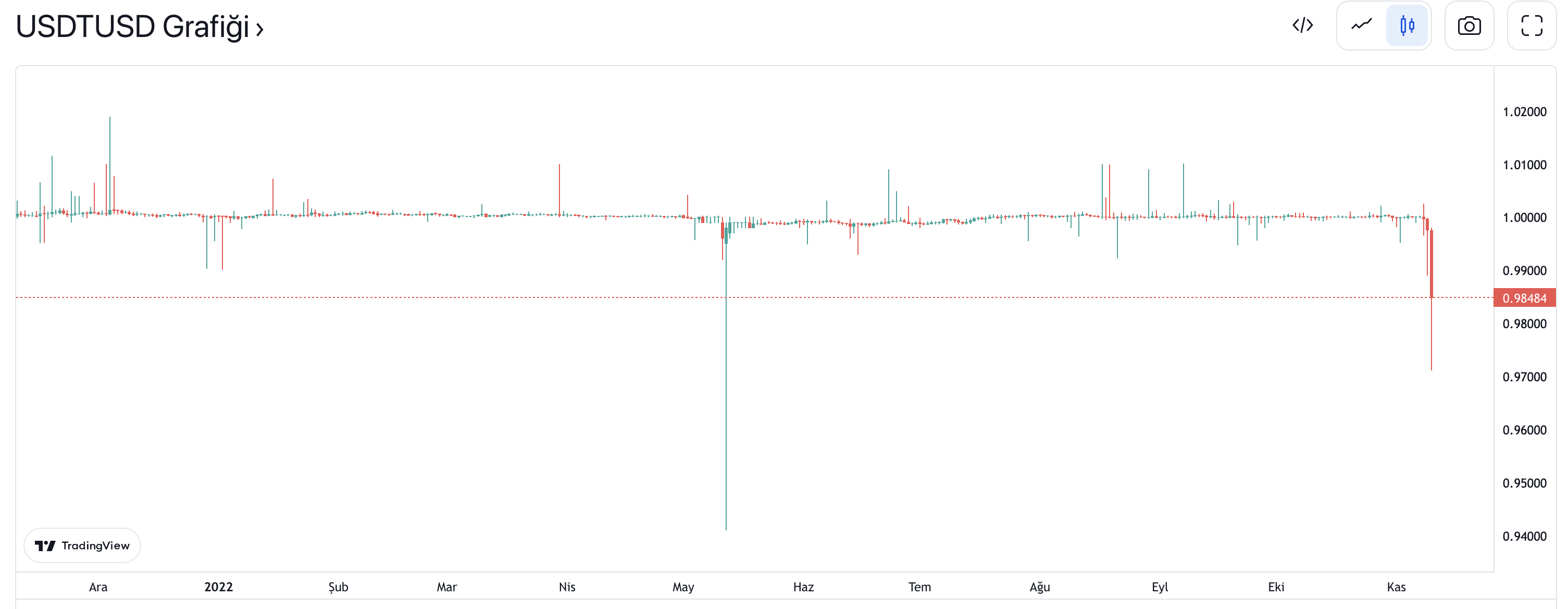 Piyasa değeri bakımından en büyük stablecoin olan Tether, bu haber yazılırken 0,977 dolardan işlem görüyordu. Öğle saatlerinde başlayan ufak peg kaymasında FTX patronu Sam Bankman Fried bağlantısı bulunması dikkat çekti. Alamede Research tarafından USDT için short işlem açıldığı iddia edildi.
